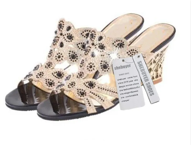 Gender: Women; Item Type: Pumps; Fashion Element: Crystal; Outsole Material: Rubber; Season: Summer; Pump Type: Slingbacks; Closure Type: Slip-On; Insole Material: PU; Occasion: Party; Lining Material: PU; is_handmade: Yes; Heel Height: High (5cm-8cm); Model Number: 688 -28; Heel Type: Wedges; Upper Material: PU; With Platforms: No; Fit: Fits true to size, take your normal size; Style: Fashion; Toe Shape: Peep Toe; Brand Name: SHEBUYER; beautiful: charm;